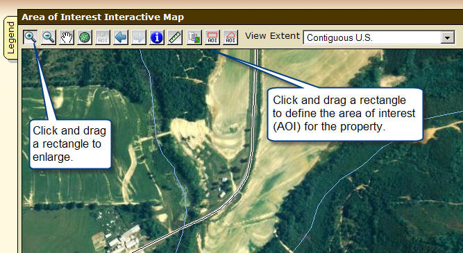 First, use Quick Navigation (left hand panel) to locate your land by address or by browsing via city & state. Then use the +magnifier to draw and enlarge areas as you drill down. The hand icon will help uncover sections outside the window.