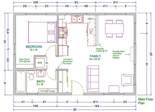 Here is the detailed floorplan for the 20' wide by 30' long layout. The bedroom and bath has standard attic trusses for a flat ceiling. A pull down stair can provide access to attic storage. The Family room can have cathedral trusses or the exposed rafter ties shown above.