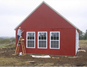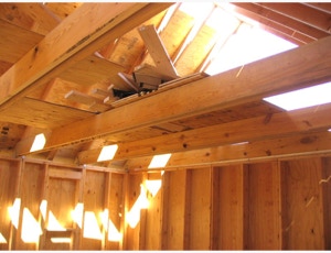 Here is an interior view for a steep pitched roof with open "timber truss collar ties". This roof is actually built as a standard rafter framed roof with beefed up collar ties every 4'. They are built from standard 2x lumber so there is no special carpentry skills needed. These heavy looking "timber trusses" are great for hanging fixtures such as fans and lights. Full details for how to build this are included.