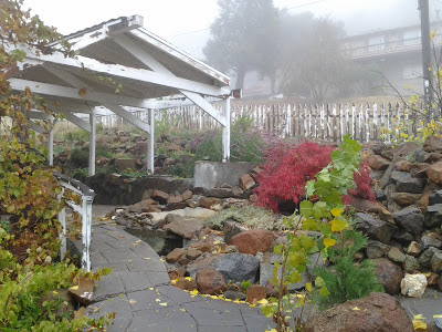 This picture made its way in here for a couple reasons.  It's the first curved bridge I did, over our fishponds.  Also you can see what the weather was like.  Also to prove SoCal can get fall colors.  Also you can see the neglect our pavilion and fence have faced since I've been building.  (The cottage project is across the street, behind this pavilion.  You'd see the roof but for the fog)