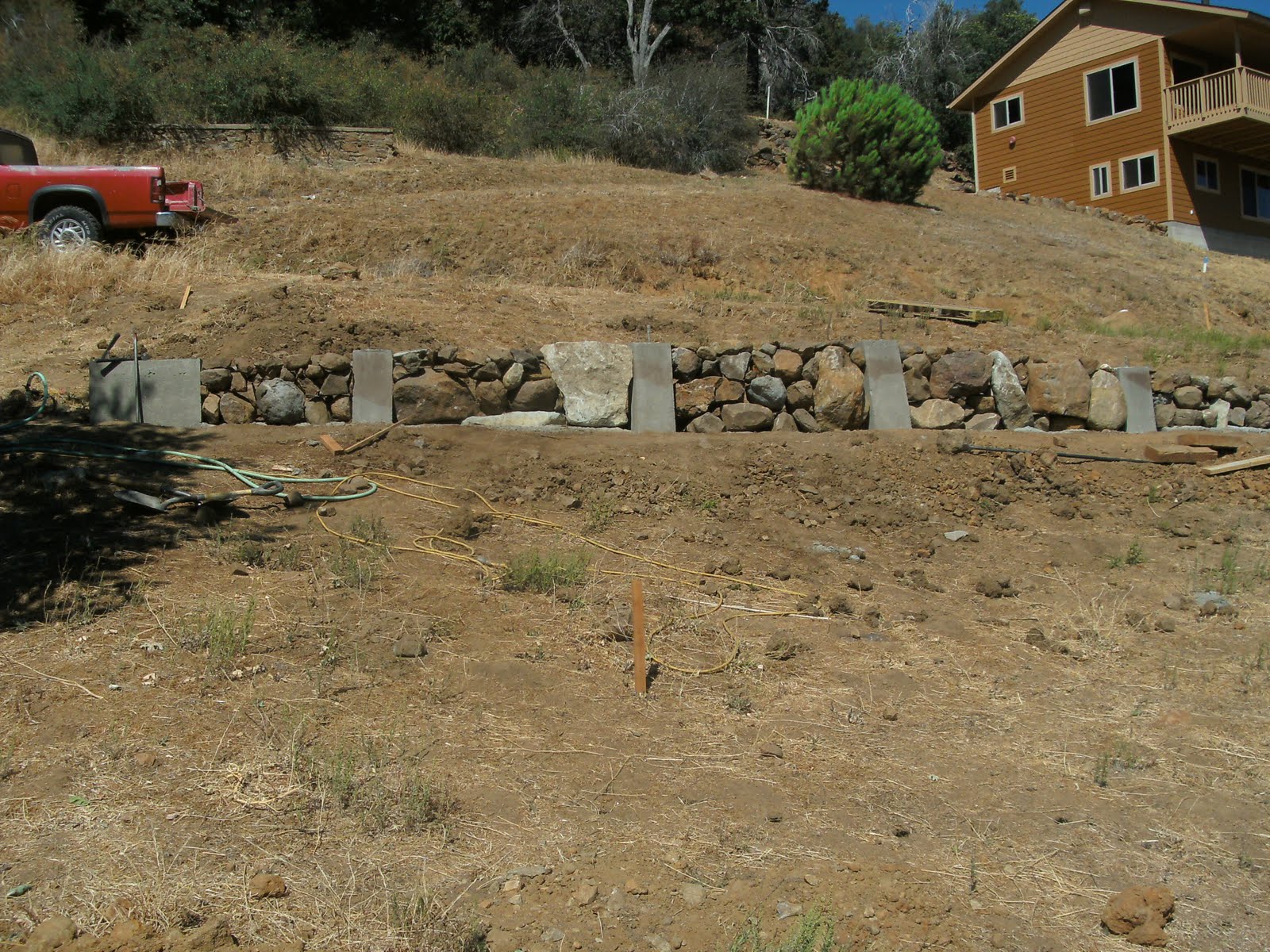 Then dry stacked stones between the pillars, being careful that every stone on the backside has something pointing towards the hillside.  Then I put a sheet of plywood behind it and dumped concrete between the drystacked stones and the plywood.