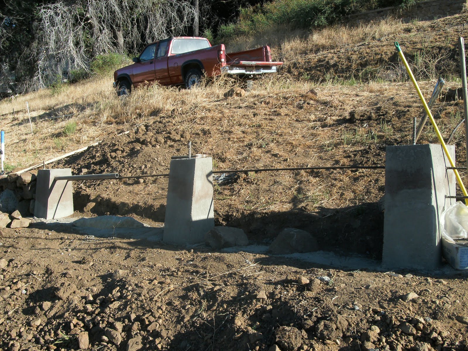 First dug a trench for a footing and formed up some pillars... (The pipe you see there was set in place to give me a good place to bend rebar in the future)