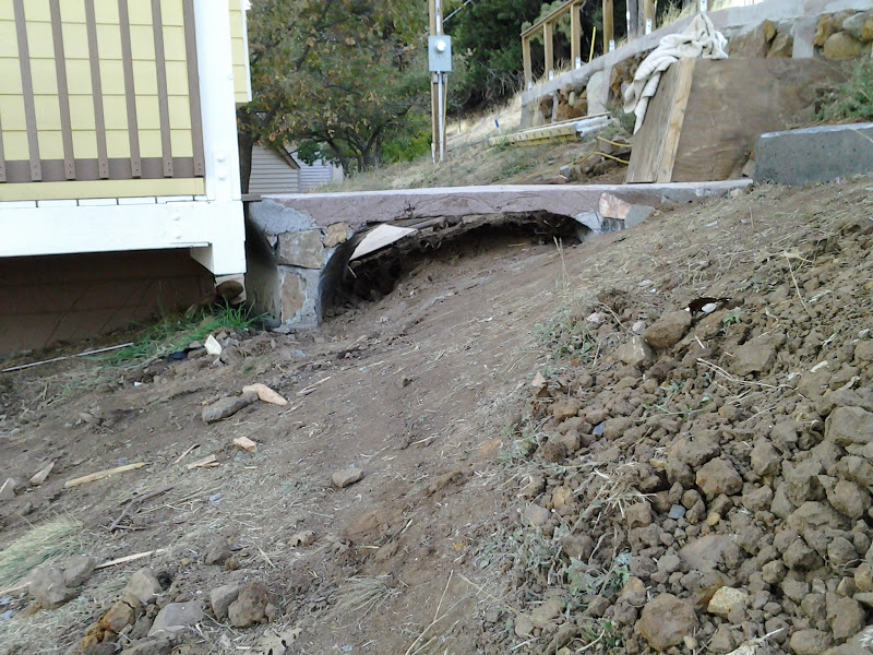 I'm kind of wishing I took more pictures of forming the bridge now.  Anyway I matched the arch to curve towards the porch.  The trick there was forming it so it didn't push against the porch beam, making removal of the form impossible.  I screwed it down from the top with a 2x6 that also served to form a pocket for the first deck board to rest its edge in.  Bending the plywood and screwing it into the bridge form was hard.  Then large stones got mortared against the forms.  I decided not to use stones on the edge of the bridge itself---I wanted it pretty thin and thought the stones would weaken it too much, so I just colored it instead.  Worse thing was, it started raining while I was mixing.