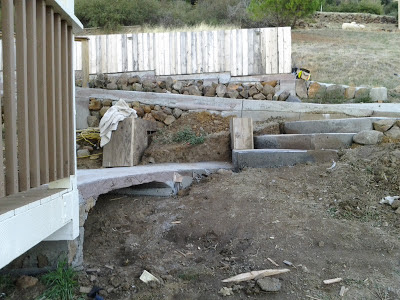 The final project necessary for completion before the final inspection is the bridge to the porch.  I'd thought about where it would start, where it would end, and how it would be shaped for many months.  Lately I'd been waffling about how complex to make it----I could do a 'just get it done' design of a couple steps down to dirt in a few hours.  I talked myself out of that though.
