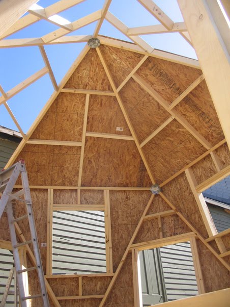the rafters are mostly all on..kind of a birds-mouth thing happening on both sides..and then fastened with those h1 simpson brackets.  next on the list is to add a rafter extension{overhang on the east} and then connect the roof to the icosa.......and then go fishing..ha ha